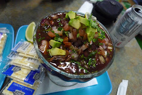 Steph C., our friend June, and I ventured out to find this hole-in-the-wall spot that has earned rave reviews from Jonathan Gold. We were looking so hard for a small sign or entrance that we completely overlooked La Cevicheria's large signage and bright blue exterior. Like three little school girls, we scurried across Pico and ran inside the restaurant.
